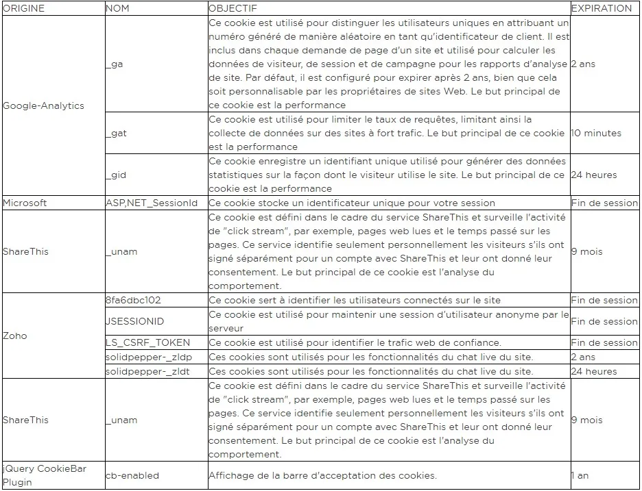 Qu'est-ce qu’un cookie ?Un cookie est un petit fichier texte placé sur votre disque dur par un serveur de pages Web. Les cookies contiennent des informations qui peuvent ensuite être lues par le serveur Web du domaine qui a émis le cookie. Tous les cookies que nous utilisons sont utilisés partout sur le site. Nous collectons vos informations avec Google Analytics, Pipedrive et Zoho via des formulaires.